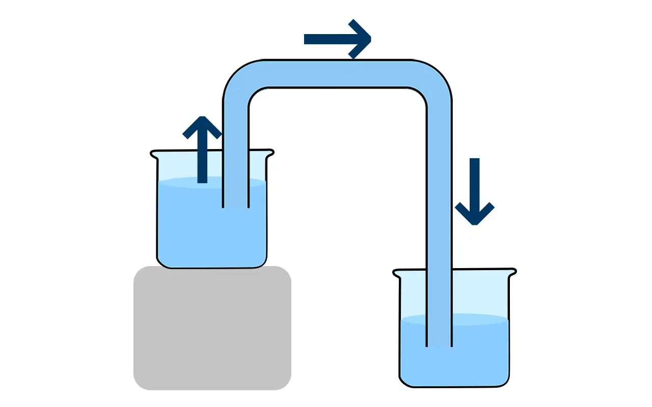 사이펀 현상은 위 그림과 같이 높이차가 있는 두 수조 사이를 물이 가득 찬 호스로 연결했을때 높은 위치의 수조에 담긴 물이 아래쪽 수조로 중력에 의해 이동하게 되는 현상입니다.